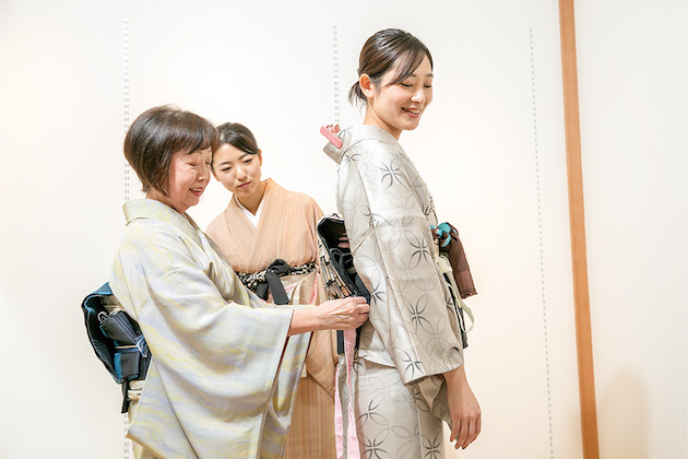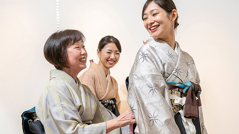 「きものを着てみたい!」という想いを気軽に叶えていただけるよう開店以来無料で開催しています。きものを着るうえでの悩みは着付が出来ないこと…。着やすくて簡単な着付けを丁寧に指導いたします。